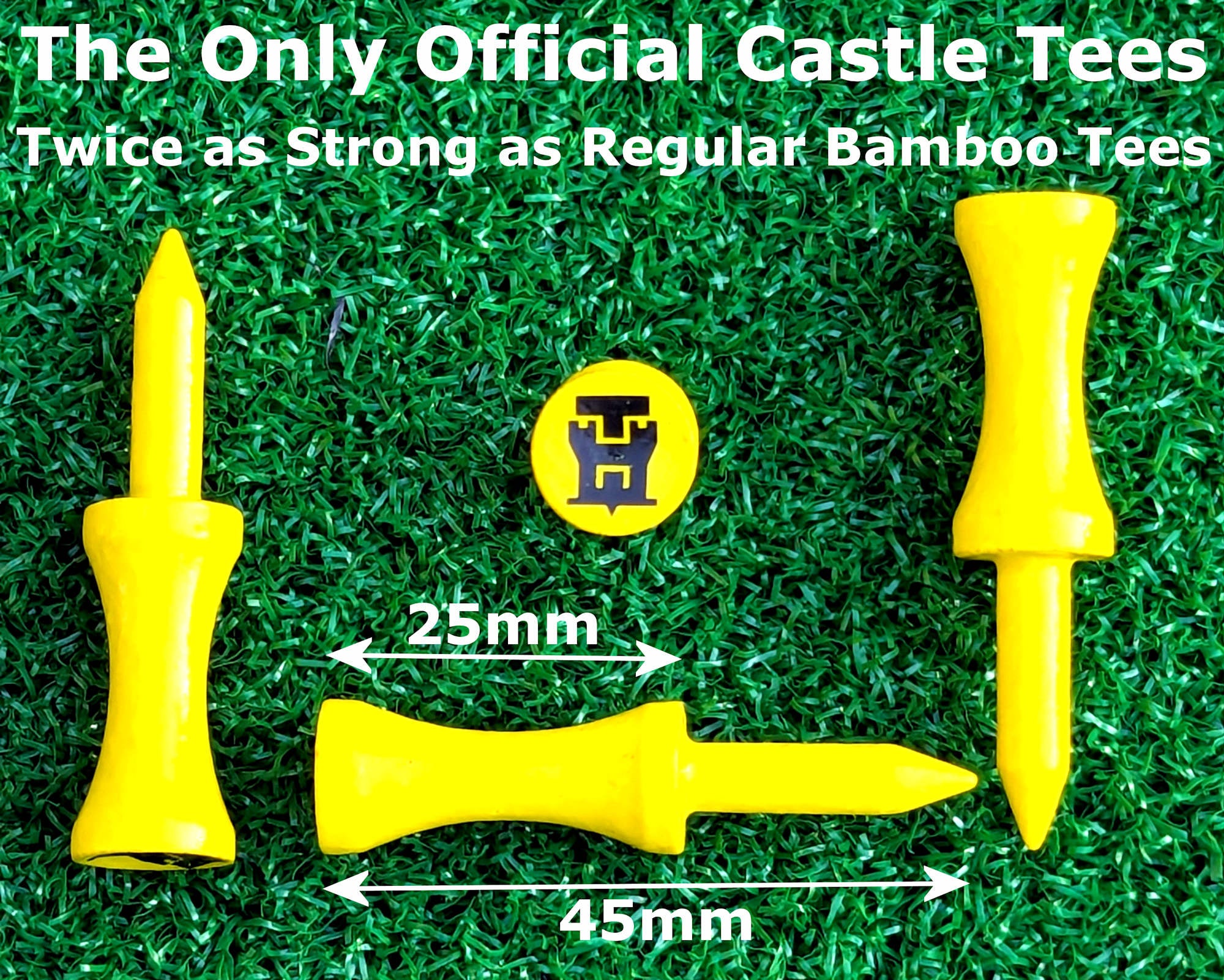 1.⛳ ✔️ Premium Official Castle Golf Tees – Pack Contains 50 Yellow Tees x 45mm / 1 ¾ Inch Tall which will raise the ball 25mm above the ground with a 20mm spike going into the turf, ideal for hitting a Driver with a Low Trajectory or an Iron, Fairway Wood or Hybrid. The Pack also Includes 10 x 42mm Bamboo White Tees ideal for hitting irons or fairway woods The Perfect Mix of Tees for the Driver, Fairway Woods and Irons.  These Tees are the same size as the Yellow plastic tees that we hope will be banned from all of our golf courses soon, some golf clubs have already banned the use of plastic Tees!