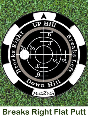 The Putt2Win Green Reader is Extremely Simple to Use. On the Putting Green Place the Green Reader Behind the Ball with the Arrow Pointing at the Hole as Shown in the Image Above. The White Bubble on the Dial of the Green Reader will move to Show the Slope of the Green Whether the Putt will Break to the Left or Right or No Break & Display if the Putt is Up Hill or Down Hill or Flat. Check out the Examples in the Images Below.