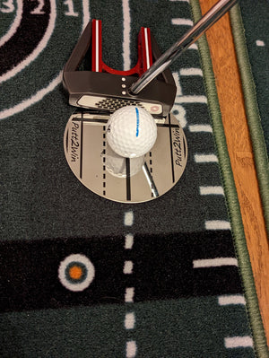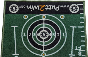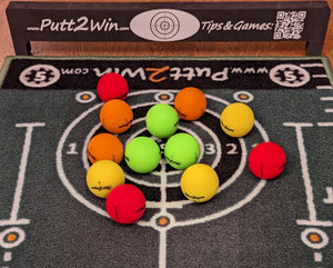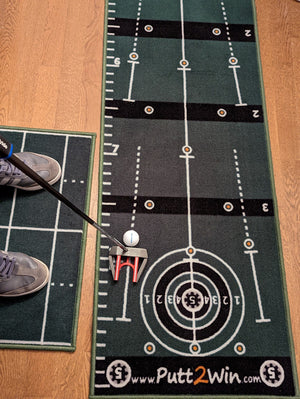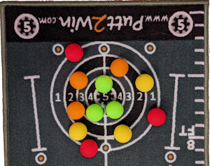 The Putt2Win mat is designed to be used in both directions up and down with various targets to aim for on the mat and at both ends. Small orange circles are printed in various locations on the mat which represent Tee Spots to Putt the ball from when practicing putting or playing the various putting games.