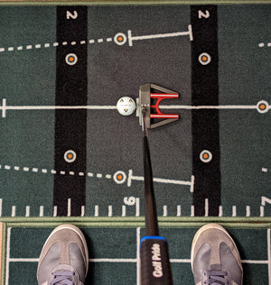Choose the area of the mat to putt from for example behind the one feet marker or place the mini mat in an appropriate area for all players to chip from. Decide the order of play and keep to the order throughout the game. Players take it in turn to putt or chip to the black bars starting with the closest at 3.5 ft. Once all players have taken a turn they move on to the next closest black bar and after the 5th / furthest black bar at 7. 5 ft has been played they move back to the closest black bar at 3.5 ft.